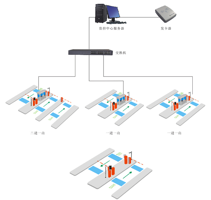 某一小區(qū)停車場為三進三出,地面為二進二出,二進二出分別不在同一個地方(都有崗?fù)?,有人值守),小區(qū)內(nèi)還有一個一進一出的地下車庫。地下車庫主要為固定用戶使用(地下車庫出入口無人值守),地面車庫固定臨時用戶都可以停放車輛,由于地下車庫的出入口和地面車庫的出入口距離較遠(yuǎn),不方便布線,地面的二個出入口崗?fù)は喔艟嚯x超過1200米。物業(yè)公司希望地面停車場系統(tǒng)與地下停車場系統(tǒng)不要布線,同時又要確保車主能從地面的任何一個入口進,又可以從任何一個入口出,并且能夠正常收費,并有財務(wù)報表數(shù)據(jù),而且卡片管理,停車場財務(wù)數(shù)據(jù)由管理處的電腦統(tǒng)一管理。